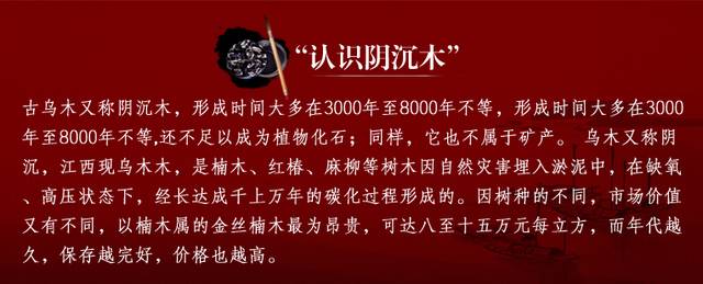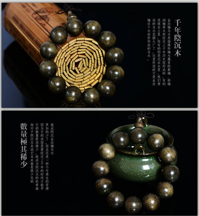 本款金丝楠选至四川,淤泥中埋藏千年之久,碳化时间非常久远。3000年以上的金丝楠木,世间稀有之极品!它的色泽接触人体后会随着人体的温度而逐渐发生变化,颜色会越来越厚润,光泽会越来越亮 。在经过人体的养护后显现的那种深沉的光泽和光芒会让人恍然它究竟是否木头!