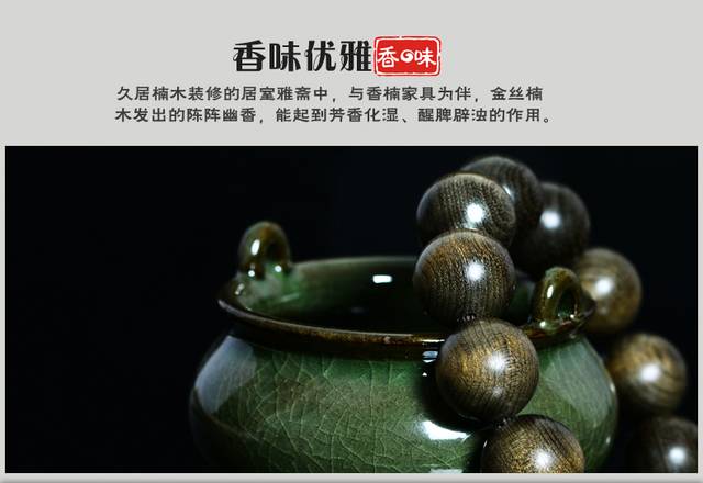金丝楠木防腐也防虫蛀,而且有一种独特的清香味,沁人心脾,有安神之效果!特别对于五行缺木的人来说,还是很有好处滴!金丝楠木自古以来都是皇家御用木头,也被称为神木,长期佩戴便有灵性,越戴越亮,越光滑,如婴儿般的肌肤。